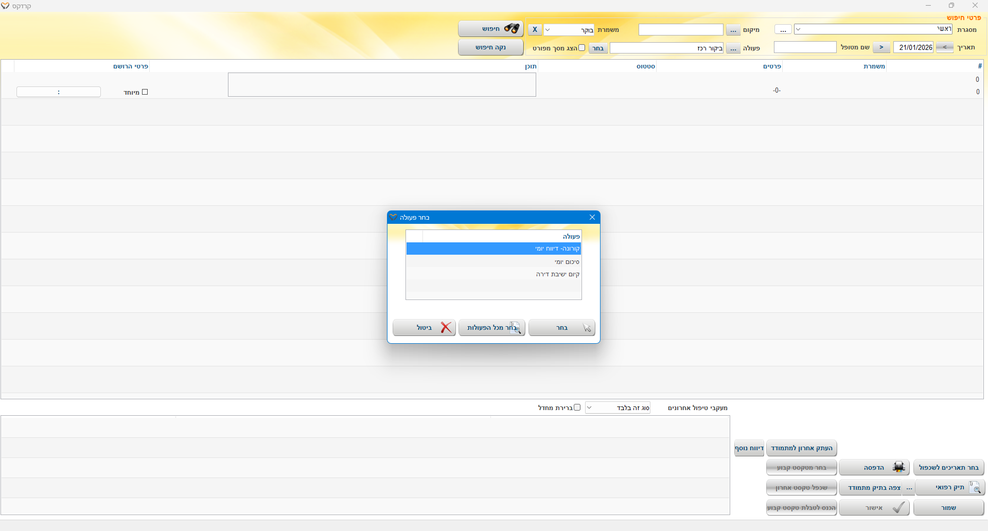 המסך הקטן הפנימי "בחר פעולה" - מציג את כל הפעולות שניתן להזין בצורה מרוכזת לכל מקבלי השירות במסגרת.