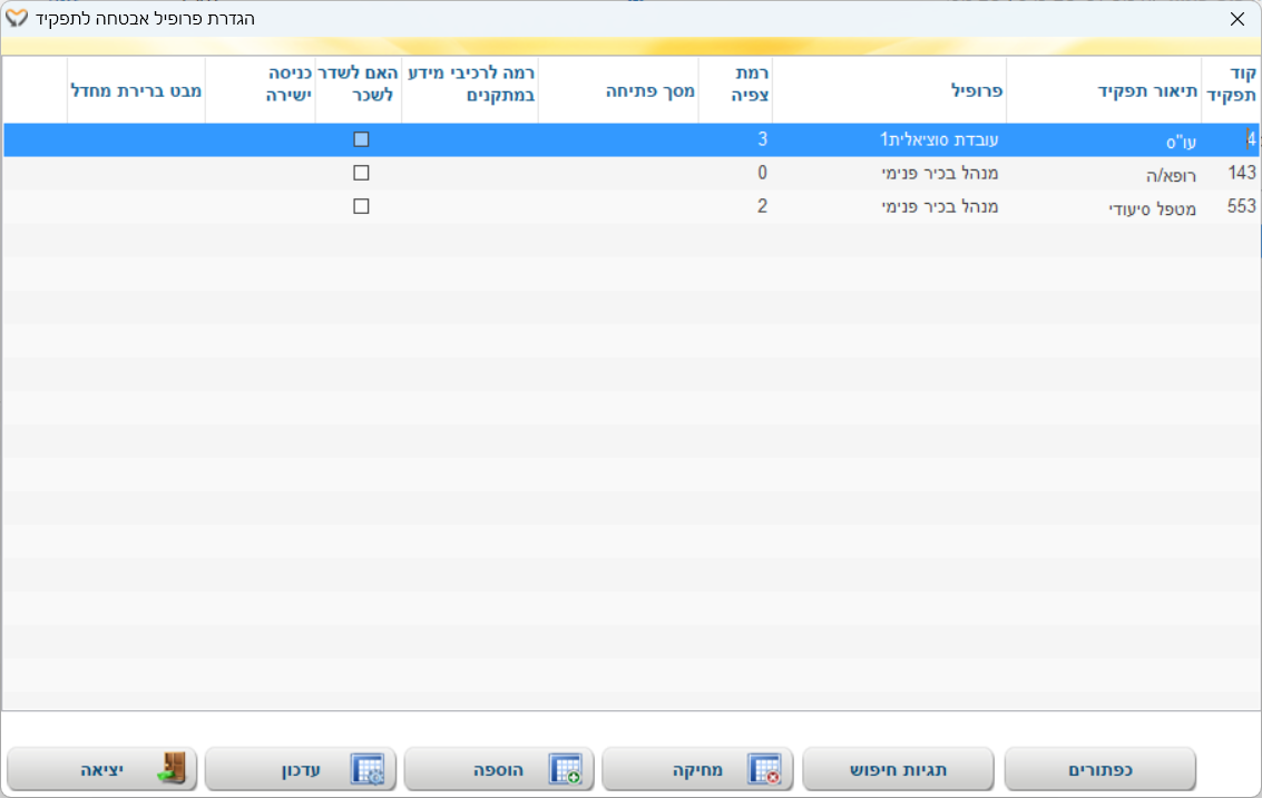 לצורך הגעה למסך זה יש להיכנס בתפריט העליון לתפריט עובדים > תפעול > הגדרת פרופיל לסוג תפקיד והמסך הבא ייפתח: