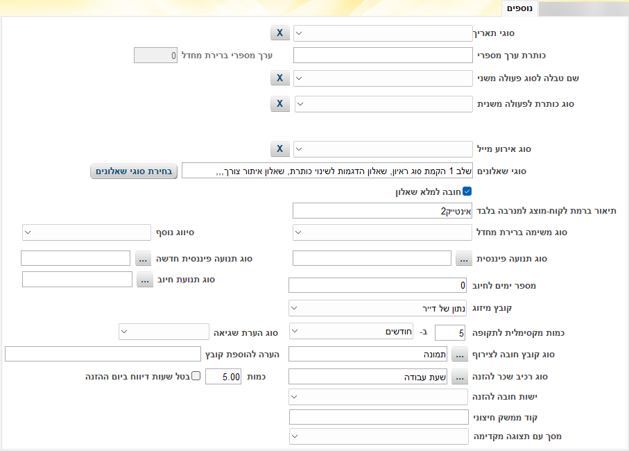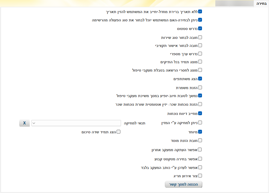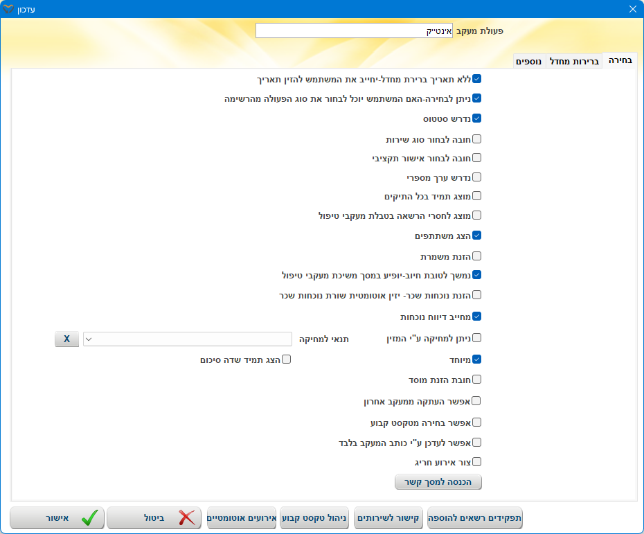 דרך מסך זה נגדיר האם ניתן לפתוח אירוע חריג מתוך המעקב טיפול, האם המעקב מוזן לשכר, האם המעקב מקושר לאישור תקציבי וכדומה.