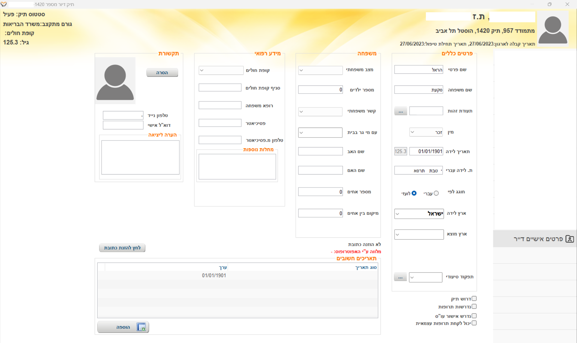 | ת.לידה עברי | תאריך הלידה העברי מוצג אוטומטית מתאריך הלידה הלועזי |