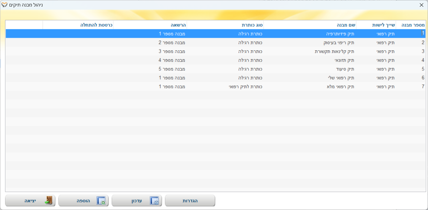 לצורך הגעה למסך ניהול התצורות לתיקים המותאמים יש להיכנס בתפריט העליון לתפריט תחזוקה > ניהול תיקי מטופלים > ניהול מבנה תיקים והמסך הבא ייפתח: