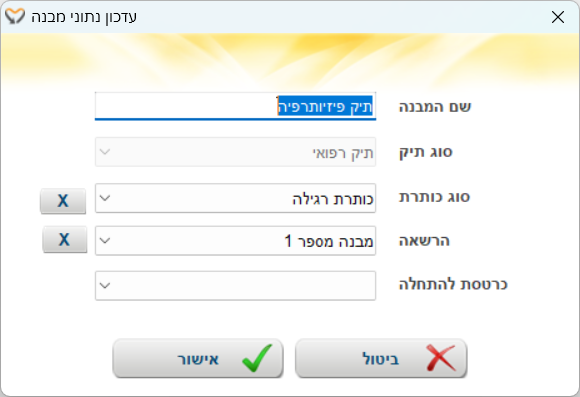 בשדה 'שם מבנה' נזין בטקסט חופשי את שם התיק לדוגמא: "תיק תזונאי".