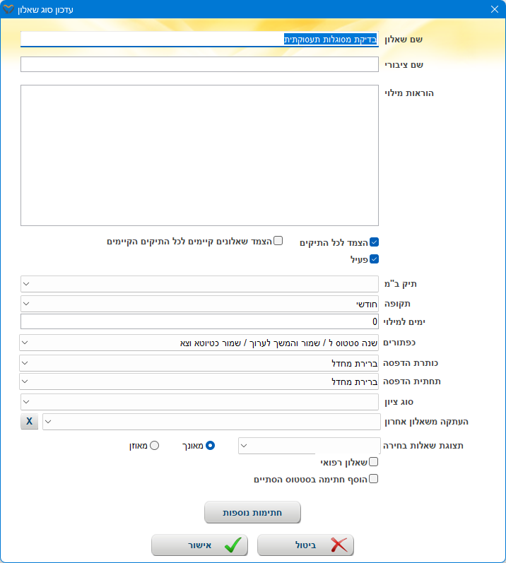 דרך מסך זה נוכל להגדיר את הכפתורים שיוצגו במסך השאלון, באיזה תיקים השאלון יוצג, מה הכותרת העליונה והתחתונה יציגו וכדומה.
