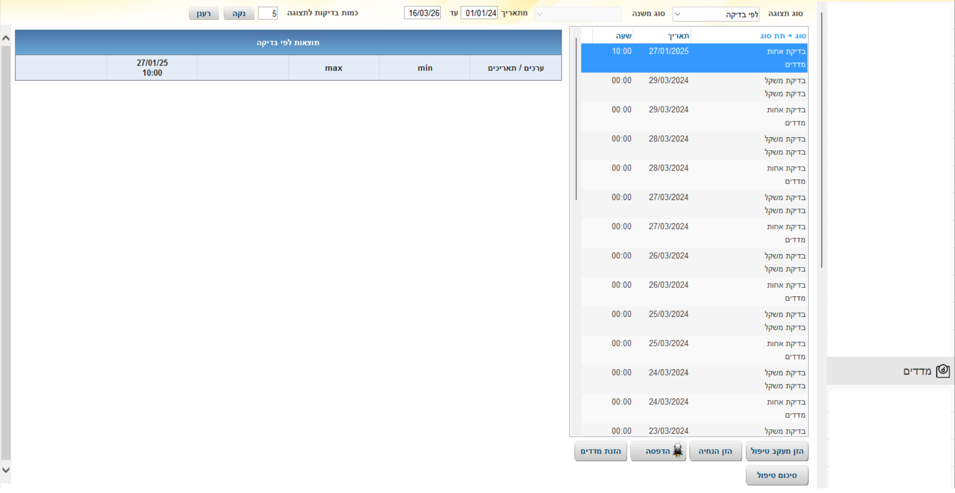 ובמסך מצד שמאל תוצג טבלה המכילה את התאריכים של הבדיקות שנבחרו לתצוגה, את רשימת הערכים שהיו בבדיקה והתוצאות של הבדיקות.