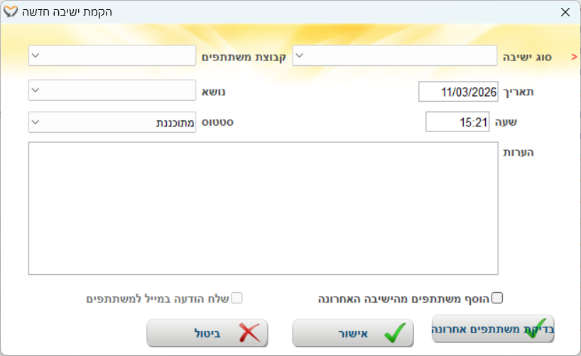 סימון שדה זה יוציא הודעת זימון למשתתפים בישיבה. שדה זה פעיל רק כאשר השדה "הוסף משתתפים מהישיבה האחרונה" מסומן. |