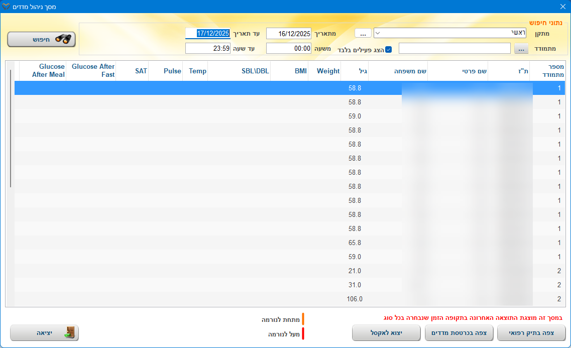 | מתקן | המתקן עבורו נאתר את כל המטופלים עבורם הזינו את המדדים |