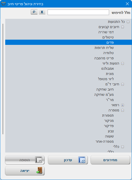 | עדכון | עדכון הפריט עליו נעמוד בעץ הפריטים. למידע נוסף ניתן לגשת למאמר הוספת/עדכון פריט לחיוב (מאמר בבניה) |