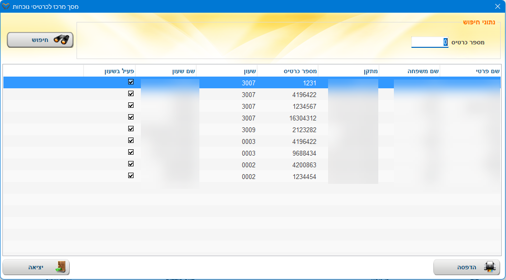 מטרת המסך לאתר מקבלי שירות על פי מספר כרטיס חישה (כרטיס נוכחות בשעון נוכחות).