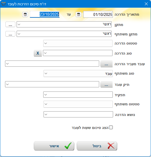 הצג סיכום שעות לעובד סימון ערך זה יציג דוח מסכם של כמות ההדרכות שבהם השתתף העובד וסך השעות של כל ההדרכות