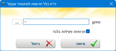 דוח אקסל אשר מציג בקובץ Excel את כל התרופות של מקבלי השירות במתקן אותו בחרנו. ניתן להגדיר האם אנו רוצים לראות את כל התרופות במערכת או רק את התרופות הפעילות.