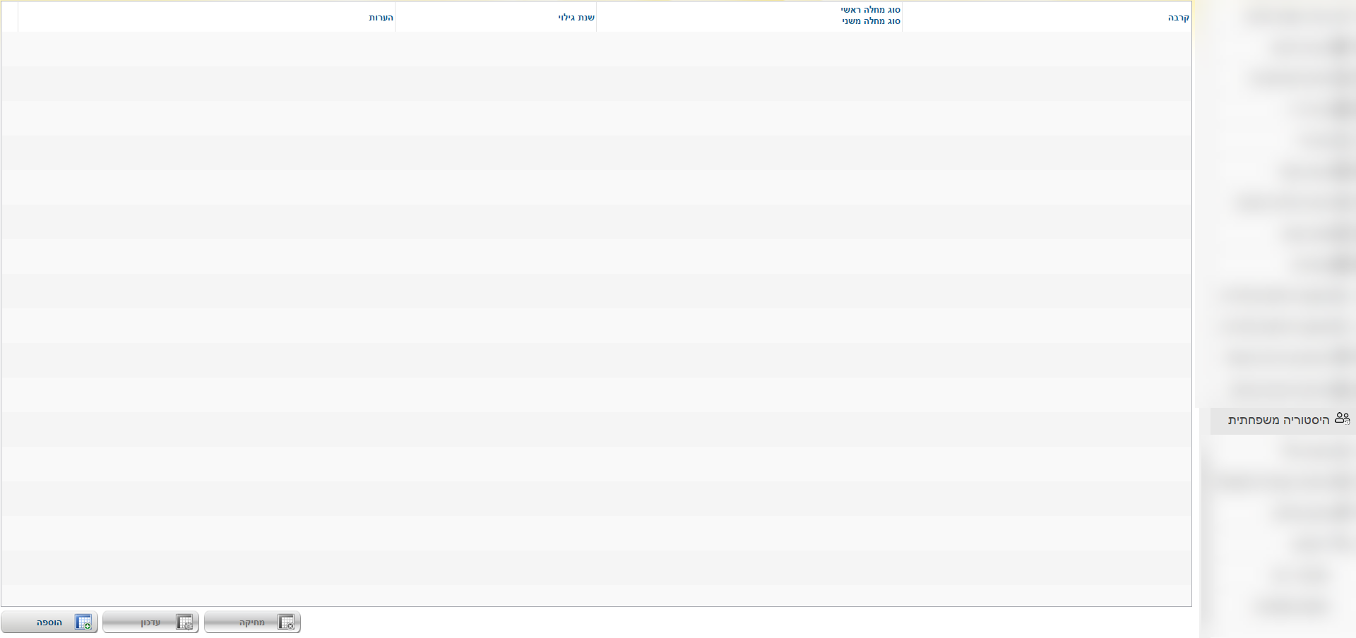 לצורך הגעה למסך זה יש לגשת לתיק הרפואי של המטופל לכרטסת "היסטוריה משפחתית" והמסך הבא יוצג: