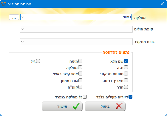 | אישור | הפקת הדוח לפי הנתונים שהגדרנו |