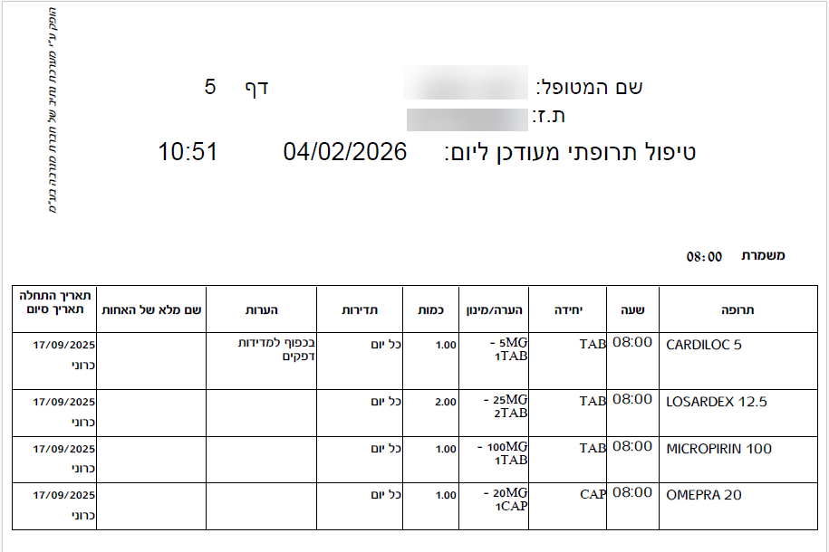 דוח טיפול תרופתי יומי לפי משמרות