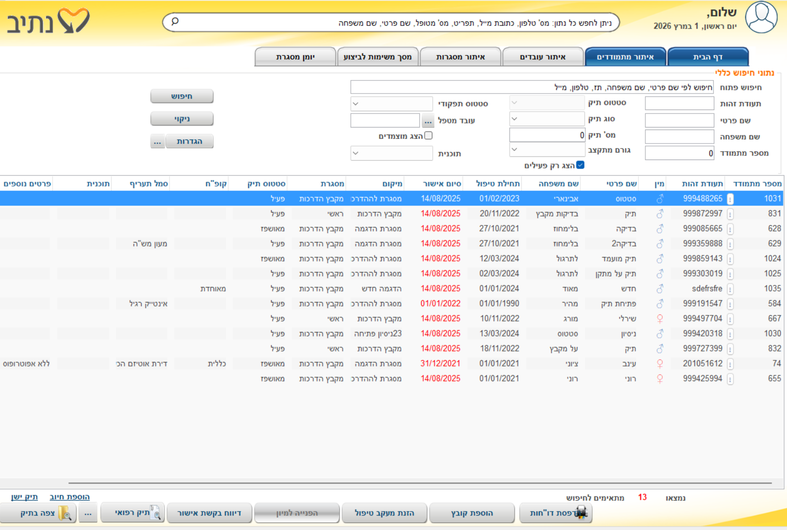 | צפה בתיק | כניסה לתיק המטופל בהתאם לשורה עליה עומדים בטבלה (חלק 2 של המסך). לפירוט על תיק המטופל יש להיכנס למאמר תיק מטופל |