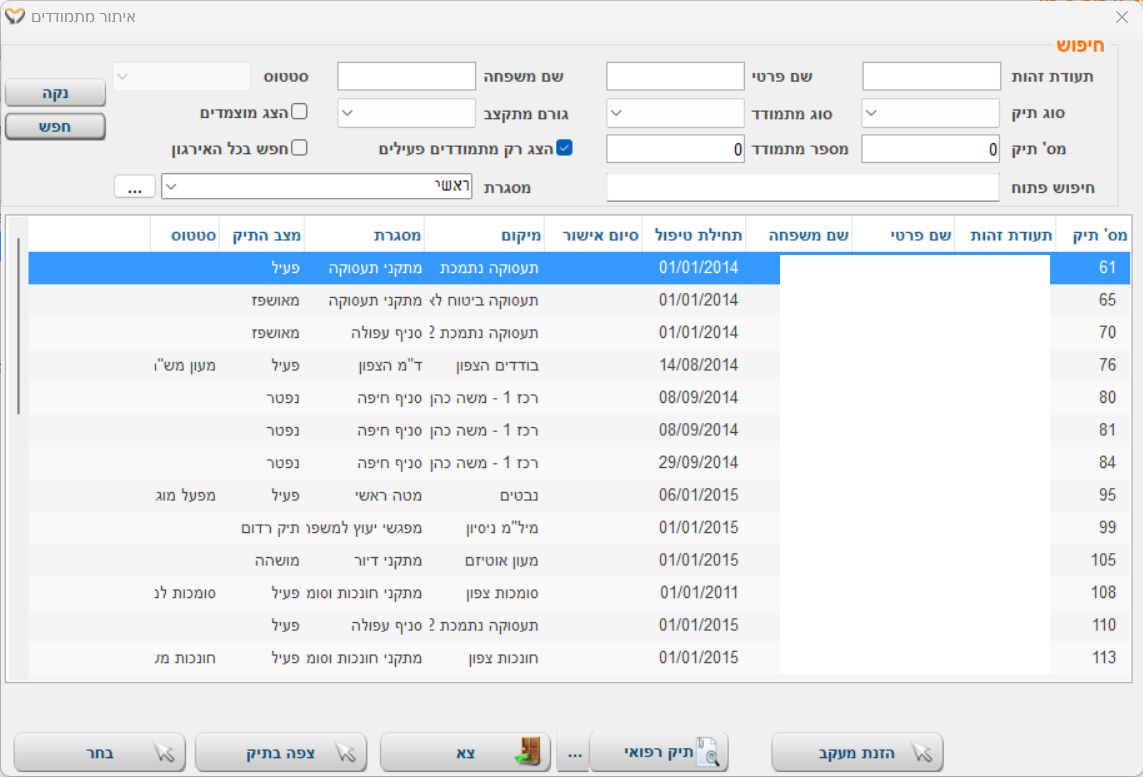 סוג תיק מטופל כמו: תיק דיור, תיק תעסוקה, תיק מפעל מוגן, תיק צבא וכו'. ניתן להגדיר את סוג התיק ברירת מחדל שיוצג במסך על ידי הגדרת הפרמטר "סוג תיק ברירת מחדל לאיתור מתמודדים" |