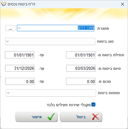 | סכום מ- ____ עד- ____ | הפקה לדוח ביטוחי נכסים בטווח סכומים מסוים |